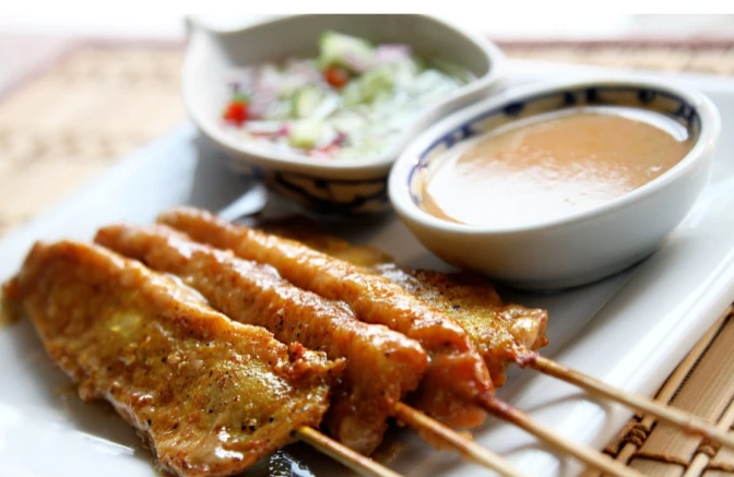 Satay is a Nanyang-style barbecue, which is marinated beef, chicken, and mutton grilled over charcoal, dipped in satay sauce made from peanut butter, coconut sauce, and young shrimp, which tastes extremely mellow.